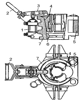 Блок вращателя представляет собой корпус клинового спайдера с червячным редуктором, работающим в масляной ванне, и водилом, передающим вращающее усилие трубному ключу. На конце червячного вала монтируется полумуфта центробежной муфты с установленными на ней сменными маховиками.