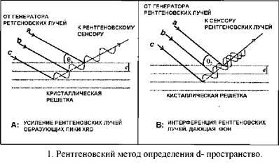 Рентгеновский анализ определяет пространство (d-пространство, измеряемое в Ангстремах) между плоскостями решётки в минералах от угла (28), при котором рентгеновские лучи с известной длиной волны диффрагируются минералом (рис.1).