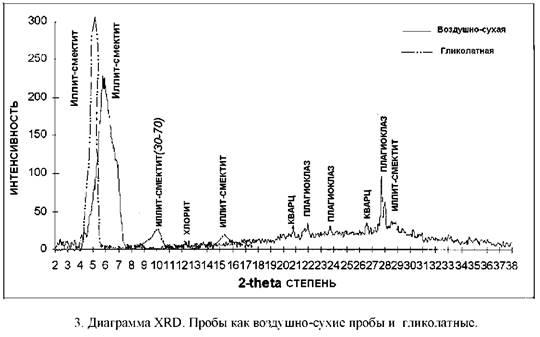 Методы препарирования, используемые для особых проб, зависят от целей. Не глинистые минералы обычно анализируются, как общий анализ порошков. Глины лучше изучать с использованием методики осаждения, которая концентрирует глинистые минералы и усиливает основные пики, хотя они подавляют пики с большими углами, которые важны для диагностики других минералов. В дополнении к стандартным воздушно-сухим анализам, пробы глин обычно испытываются после обработки этилен гликолем (рис..3), который расширяет межплоскостные пространства решётки любой разбухающей глины, которая присутствует в образце (т.н. смектит).