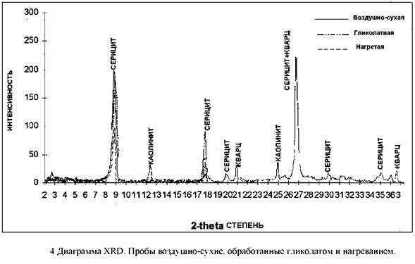 Размер расширения связан с долей разбухающей глины в смеси и, таким образом, доля смектита в смешанослойных иллит-смектитовой и хлорит-смектитовой глинах может быть легко определена до 10%. Пробы могут также исследоваться после обработки нагреванием, поскольку различные минералы разрушаются под действием разных температур (рис..4). Это особенно полезно при определении кандитовых глин, поскольку каолинит разрушается ниже 550°С, тогда как диккит сохраняет свою структуру при более высоких температурах.