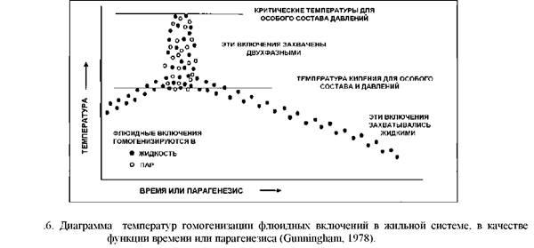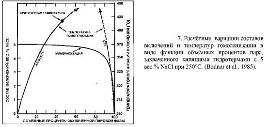 2.Если первичные гидротермы были не однофазными, то отношение газа к жидкости не будет одним и тем же во всех включениях, поскольку они захватывались из разных смесей жидкость+пар. Температуры гомогенизации будут в этом случае колебаться в более широких интервалах. Однако превышение пара по занимаемому объёму более важно, чем превышение жидкой фазы. Такой ряд температур гомогенизации будет систематически завышен (рис. 6, 11.7).