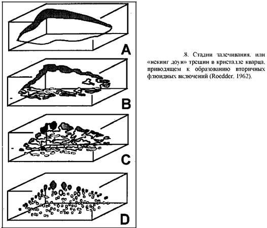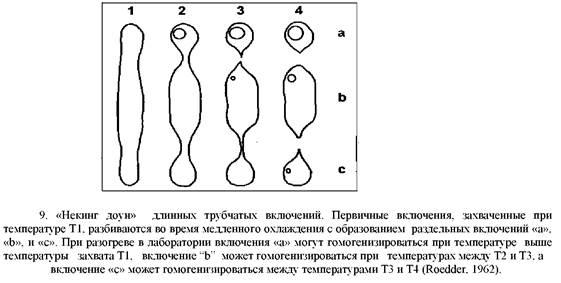 4. Некинг (отсекание пузырьков сужением вытянутого включения «обжим»). Рост кристалла может продолжаться после отложения, включая рост внутренней грани с включениями, что сопровождается изменениями физических пропорций (долей фаз) включений. Это может часто наблюдаться при их появлении. Некоторые минералы менее подходящие, чем другие. Такие включения не дают надежных температур гомогенизации и, если они встречаются, то не могут привлекаться для измерений.