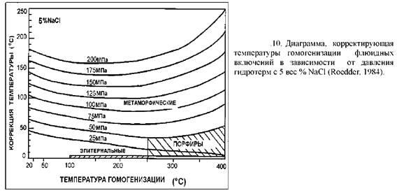 В порфировых структурах коррекция меньшая, обычно около 50°С. В эпитермальных жилах требуется максимальная коррекция около 10°С. В этом случае, получаемые данные находятся в пределах точности других допущений и в связи с этим обычно поправками пренебрегают. Но это необходимо иметь в виду. Этот факт является одной из причин, почему корреляция между температурой флюидных включений и минералогией не всегда соблюдается даже в эпитермальных жилах (и это также имеет значение для определения минералов-геотермометров на основании термометрии по флюидным включениям). Этот аспект должен рассматриваться при исследовании жильных текстур, которые могут свидетельствовать о фазовом состоянии гидротем. Если это так, то, по-видимому, давление, при котором происходило образование минералов, будет меньше гидростатического давления, и коррекция давления будет небольшой, создавая большую уверенность в полученных результатах.