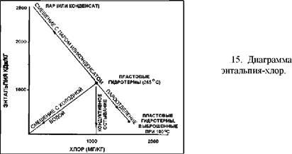 . Если имеется значительное количество измерений, то полезны гистограммы (рис..14). Идеальным считается нанесение результатов на графики энтальпия-минерализация, поскольку смешение, кипение и остывание взаимосвязаны на графике в виде прямых линий (рис..15). Это обычно не делается, если данных недостаточно. График точек гомогенизации/замерзания является приближением к этому, а не плохим первым шагом (рис..16), но трудно знать, что делать с точками, где нет измерений минерализации. Если данные получены из проб, отобранных из значительно большего вертикального интервала (из скважины), то полезно построить графики с наложением вертикального масштаба на кривые точек кипения-глубина.