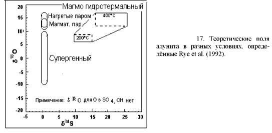 Изотопный анализ выполняется на порошках, обычно для отдельных минералов, которые выделяются из образцов (обычно магнитным или гравитационным методами). Они дают информацию о температуре гидротерм, которые отложили минералы, а также об их магматическом или метеорном генезисе. Так, например, анализом изотопов серы и кислорода в гидротермальном алуните можно определить отложен ли алунит первичными гидротермами, или гидротермы образовались в результате субповерхностного окисления (рис..17), что имеет важное значение для рудной минерализации.