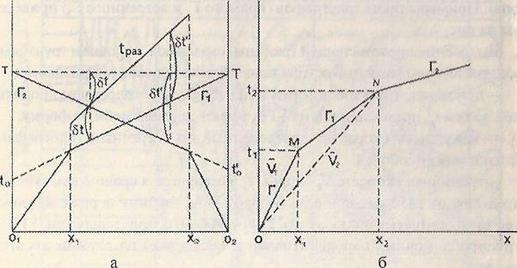 Для повышения достоверности получаемых результатов в сейсморазведке применяют системы наблюдений с перекрытием (один и тот же участок преломляющей границы изучают несколько раз). При применении методики первых вступлений часто бывает достаточно использовать систему однократного перекрытия (систему встречных годографов). Примеры таких годографов (прямого Г1