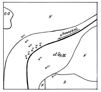 Поисковые работы включили анализ материалов ранее выполненных работ, состоявших из геологической съемки 30-х годов масштаба 1:100000 (рис. 1) и других видов работ. В результате этого установлено, что аллювиальные отложения реки Назарбай заключают значительные запасы пресных подземных вод, пригодных для хозяйственно- питьевого водоснабжения.