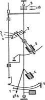 При изменении азимута магнитная стрелка пружинными контактами 4 закорачивает часть реохорда. Сопротивление незамкнутой части пропорционально азимуту φ. При измерении угла стрелка указателя угла отклонения, жестко скрепленная с отвесом, переместится на дугу δ и закоротит реохорд. Сопротивление незакороченного участка реохорда пропорционально углу δ.