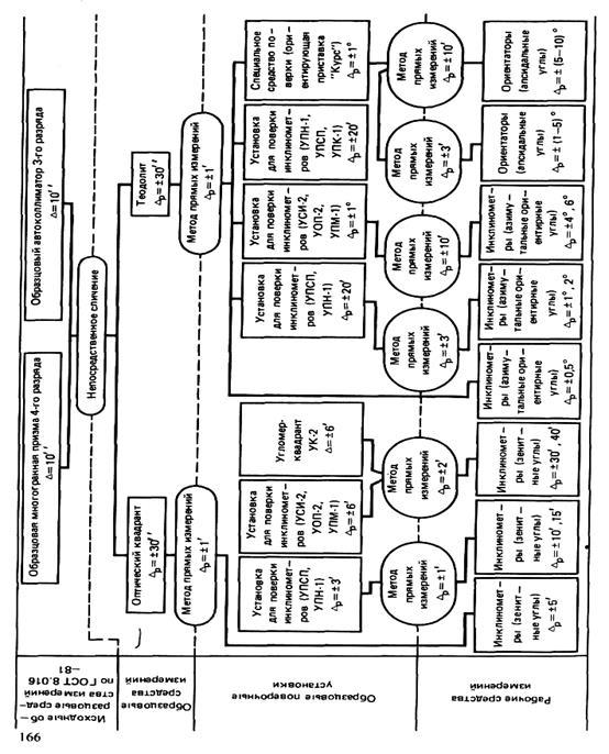В качестве исходных образцовых средств измерений в поверочной схеме предусмотрено использование образцовых многогранных призм 4-го разряда и автоколлиматоров 3-го разряда из государственной поверочной схемы по ГОСТ 8.061-80 с погрешностью 10".