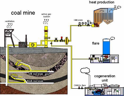 Процесс дегазации, с помощью которого извлекается шахтный газ, изначально развивался в целях повышения безопасности угольных шахт. При подземной добыче угля угольной компании приходится бороться с шахтным метаном, который выделяется в процессе разработки угольных пластов. Так как метано-воздушная смесь является взрывоопасной при концентрации метана от 5 до 14%, угольной компании необходимо принимать соответствующие меры, чтобы избегать опасного диапазона[3].