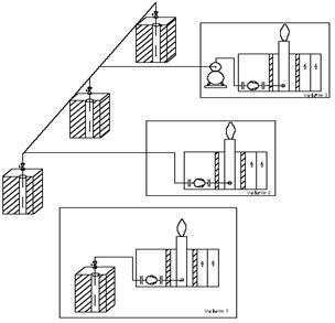 Первый вариант. Производится откачка шахтного газа из стволов шахты вентиляторными установками. Концентрация метана (горючих газов) в данном газовом потоке составляет 0,75%, что делает непригодным этот газ для дальнейшего использования в связи с тем, что в газовом потоке, откачиваемом из шахты идет большое количество угольной пыли, которая негативно влияет на работу вакуумного насоса. Данную пыль необходимо удалять. Сепаратор устанавливается перед вакуум-насосом для удаления мельчайших частиц пыли и влаги.