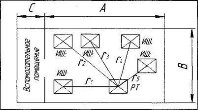 Дано: В рабочем помещении длиной А м, шириной В м, и высотой Н м размещены источники шума – ИШ1, ИШ2, ИШ3, ИШ4 и ИШ5 с уровнями звуковой мощности. Источник шума ИШ1 заключен в кожух. В конце цеха находится помещение вспомогательных служб, которое отделено от основного цеха перегородкой с дверью площадью. Расчетная точка находится на расстоянии г от источников шума. Sт