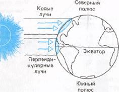 | рис. 1.1. Лучи солнечного света, падающие на Землю в высоких широтах, распределяются по большей площади, и поэтому интенсивность их в каждой дайной точке ниже, чем интенсивность лучей, падающих на Землю вблизи экватора. |
