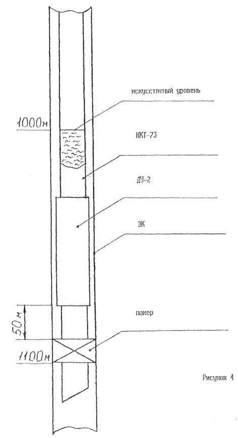 В процессе ремонтных работ на скважине после изоляции обводнившихся горизонтов и ликвидации негерметичпостей необходимо проверить цементный мост и вксплутащгакнуго колонну па герметичность понижением уровня в скважинй, для чего необходимо заказать СВабируГОщуга установку, произвести отбор жидкости с необходимой глубины и проследить за уровнем. Для решения поставленной задачи Предлагается вместо заказа свабиругощеи установки использовать компановку с ДУ (рис.4). Пакёр с ДУ спускается на глубину 1100 м при понижении уровня па 1000 м. Внутренняя полость НКТ заполняется промывочной жидкостью из расчета получения уровня 1000 м, сажается пакер и производится его опрессовка, После открытия ДУ прослеживается уровень, который не должен подняться выше расчетного по отношению к внутренним объемам эксплутационной колонны и НКТ.