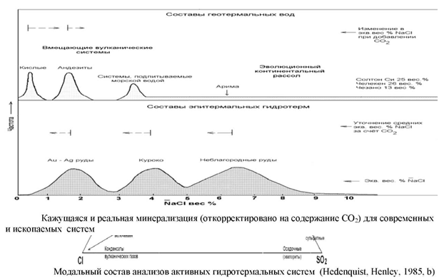 , можно видеть, что кажущаяся минерализация месторождений рудных благородных металлов частично совпадает с реальной минерализацией (NaCl + KCl + CaCl2 и др., всё выражено в виде экв. NaCl) современных геотермальных систем, размещённых в кислых и андезитовых вулканических структурах; колебания концентраций СО2