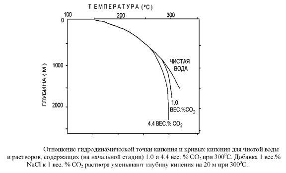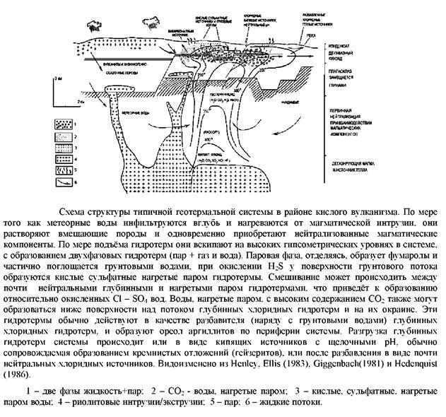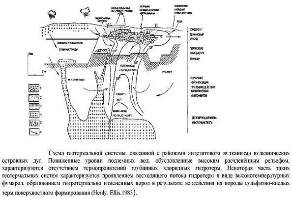 С этих позиций будет рассмотрено формирование гибридных вод в эпитермальных системах на примере базовой модели, предложенной Хенли и Эллисом. Она объясняет особенности, наблюдаемые в гидротермальных системах, расположенных в кислых структурах. В следующем разделе будут обсуждены взаимосвязи кипения и глубины, газоотделения при кипении, смешивания и т.д.