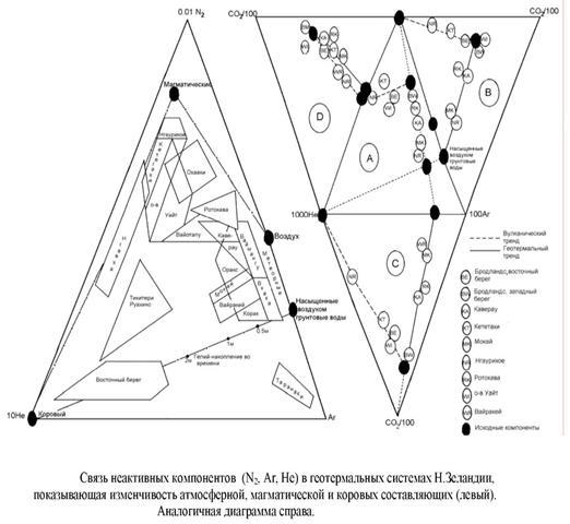 составляют значительную долю в виде окисленных газов магматических флюидов, содержание которых уменьшается в результате их взаимодействия с вмещающими породами гидротермальной системы. В периоды разогревания HCl, HF, а также самородная сера, становятся летучими и, как только дренирующая система очищалась от этих продуктов, конечный член магматического флюида, содержащий значительный процент CO2