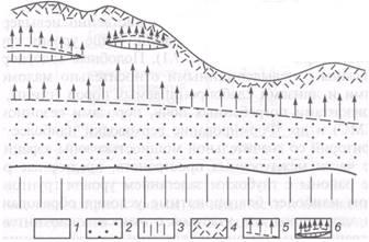 Обобщенный гидрогеологический разрез земной коры, характеризующий условия залегания подземных вод и принципиальную схему их движения, приведен на рисунке 1.