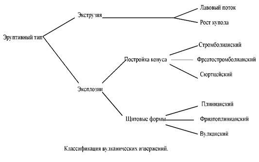 Извержения для удобства можно разделить на экструзивные и эксплозивные. Схема показана на рис. 2.3. Оба типа извержений могут проявляться на одном и том же вулкане. Экструзивные извержения характеризуются магмой, малонасыщенной летучими, в которой вязкость ограничена выделением последних, что приводит к выбросу жидких магм на поверхности. Эксплозивные извержения - это быстро дегазирующая магма сопровождается интенсивным разрушением как магмы, так и вмещающих пород.