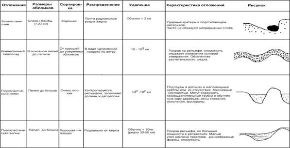Отложения пирокластических потоков могут быть следствием нескольких процессов. Наиболее важные включают обрушение эруптивной колонны, наклонные эруптивные колонны ударных волн, или пассивное, не взрывные обрушения лавовых потоков или куполов. Маленькие потоки обычно связаны с обрушением куполов или частичным обрушением эруптивных колонн, в то время как большие потоки обычно приводят к крупным извержениям силикатной магмы и в результате чего, насыщенной пемзой. Разновидности пирокластических потоков показаны в табл. 2.4