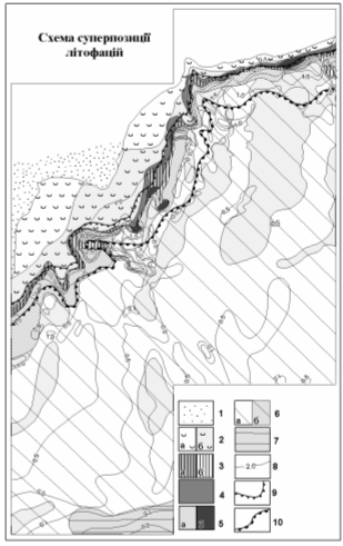 1-новоэвксинские пески, перекрытые новочерноморскими мидиевыми илами; 2-новоэвксинские ракушечники, перекрытые: а) новочерноморскими мидиевыми илами, б) новочерноморскими мидиевыми илами и алеврито-пелитовыми фазеолиновыми илами; 3-новоэвксинские алевритовые глины, перекрытые: а) новочерноморскими алеврито-пелитовыми фазеолиновыми илами, б) новочерноморскими кокколитовыми илами; 4-новоэвксинские алеврито-пелитовые илы, перекрытые новочерноморскими алеврито-пелитовыми фазеолиновыми илами; 5-новоэвксинские алевритовые глины: а) перекрытые древнечерноморскими сапропелевыми илами и новочерноморскими кокколитовыми илами, б) выходящие на поверхность дна; 6-новоэвксинские глины, перекрытые а) древнечерноморскими сапропелями, сапропелевыми илами и новочерноморскими кокколитовыми илами, б) древнечерноморскими сапропелями, сапропелевыми илами и новочерноморскими алевритовыми кокколитовыми илами; 7-новоэвксинские глины, перекрытые древнечерноморскими сапропелями и новочерноморскими пелитовыми илами; 8-изопахиты голоценовых отложений (м); 9-бровка шельфа; 10-граница континентального подножья.