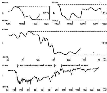 На рис.2 приведены результаты анализа климата Земли за последние 130-140 тыс. лет, выполненные по кислороду (в Гренландии) и по радиоуглероду (во Франции). Оба анализа независимо друг от друга указывают на наличие холодного периода в интервале 70-15 тыс. лет назад. В это время средняя глобальная температура была на 2-5°С ниже современной.