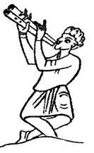 Бубни та барабани супроводжують не лише спів, виступи труверів, - їх беруть в руки також мандрівні танцюристи, актори, жонглери; жінки танцюють, супроводжуючи свої танці грою на бубнах. Бубен (tambour, basquei) при цьому тримають в одній руці, а іншою, вільною, у нього ритмічно б’ють. Іноді менестрелі, граючи на флейті, акомпанували собі на бубні або барабані, який вони закріплювали на своєму лівому плечі зо допомогою ременя. Менестрель грав на флейті, супроводжуючи спів ритмічними ударами у бубен, які він здійснював головою. [Рис. 3.10]