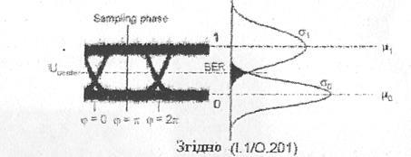 Згідно з 0.201 (див. рис.1) Q-фактор визначається як: . Тут та - рівні напруги передачі «1» та «0», а та є девіаціями розподіленняшуму на рівнях "1" та "0".