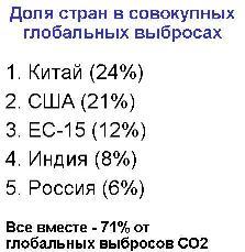 На долю России приходится примерно 6% выбросов парниковых газов развитых стран. В настоящее время по объемам выбросов она занимает четвертое место после Китая, США и Индии.
