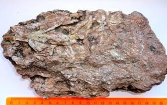 В породе видна трещиноватость, которая не имеет какой-либо ориентировки. Особенность породы – кристаллы кианита размером до 0,8×2,5 см радиально лучистого строения, серого цвета.