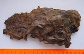 Порода бурого цвета, равномерная окраска обусловлена развитием гематита и магнетита по всей породе.