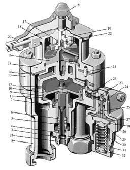 Редуктор крана (рис. 2) состоит из корпуса 26, верхней части с запрессованной втулкой 25 и корпуса 29 нижней части. В верхней части находится возбудительный клапан 24, прижимаемый к седлу пружиной 23, которая другим концом упирается в заглушку. На металлическую диафрагму (мембрану) 27 диаметром 78 мм снизу через опорную шайбу 28 действует пружина 30, упирающаяся через центрирующую шайбу 32 в винт 31. Редуктор служит для поддержания определенного давления в уравнительном резервуаре при поездном положении.
