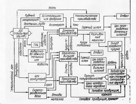 - разнообразие грузопотоков и их жесткая связь с технологией основного производства. По сравнению с подсистемами транспорта предприятий добываю-щей промышленности, где приходится иметь дело с массовыми потоками одно-родных грузов, на металлургическом заводе резко возрастает число невзаимоза-меняемых потоков, различающихся родом груза, направлениями перевозок, условиями и срочностью доставки, типом используемого подвижного состава и др. По сравнению с машиностроением, где грузопотоки еще более разнообразны, на ме-таллургических заводах транспорт непосредственно влияет на технологию, осо-бенно на участках "горячих" перевозок, где связь между транспортными и техно-логическими агрегатами осуществляется без складирования продукции;