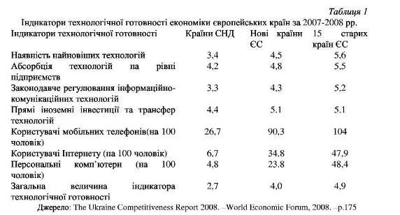 В таблиці 1 подано результати як експертних оцінок індикаторів технологічної готовності економіки країн СНД, нових країн ЄС та 15 старих країн ЄС ( найнижчий показник 1, а найвищий показник 7), так і статистичні дані щодо забезпеченості комп'ютерами , Інтернетом та мобільними телефонами. Загалом спостерігається певний регрес в даному компоненті технологічного розвитку країн СНД . Надзвичайно низькі показники щодо трансферу технологій через механізм прямих іноземних інвестицій, який є домінуючий в постсоціалістичних країнах Центральної та Східної Європи, які вступили в Європейський Союз. Темпи зростання кількості персональних комп'ютерів на 100 чоловік досить високі (більше 60% за три роки), але на жаль по абсолютній величині це більш, ніж в три рази менше , ніж в Росії і в 12 раз менше, ніж в Естонії. Загальне відставання України за інтегральним показником технологічної готовності економіки від розвинутих ( США, країни ЄС) більше, ніж в два рази, а по групі постсоціалістичних країн ЦСЄ відставання складає 20-30%, що свідчить про слабкі адаптивні можливості до впровадження нових технологій в українську економіку.
