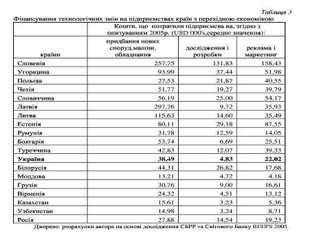 В таблиці № 3 показано, що українські підприємства значно відстають від країн - нових членів ЄС у фінансуванні досліджень і розробок, майже у п'ять разів, як не дивно ми відстаємо і від Білорусі та Росії. Науково-технічний прогрес реалізується безпосередньо на виробництві, а виробництво повинно задовольняти нові потреби населення.