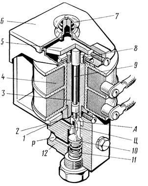 Привод состоит из цилиндра 3, в котором находятся отключающая пружина, шток, поршень и крышка электромагнитного вентиля 2. Поршень уплотнен резиновыми манжетами.