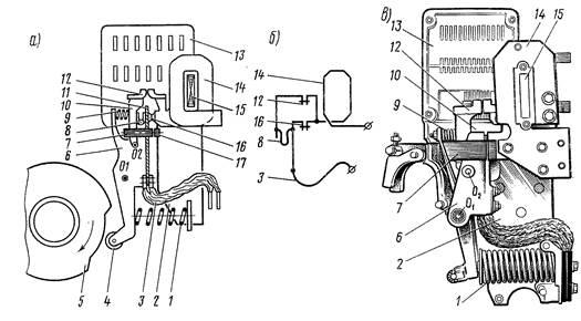 Основой выключателя ВОВ-25-4М является силуминовый корпус 12 (рис. 1), которым выключатель крепится к крыше электровоза. Уплотнение между корпусом и крышей обеспечивается резиновым шнуром. К корпусу с помощью патрубка прикреплен воздушный резервуар 11 емкостью 32 л. Во время процесса отключения сжатый воздух из резервуара подается в дугогасительную камеру через патрубок 10 и полость наклонного изолятора 9. Из резервуара выведена трубка, предназначенная для выпуска сжатого воздуха и конденсата. Трубка оканчивается в корпусе штуцером, к которому подсоединяется труба с запорным вентилем. Другой штуцер служит для подсоединения питающего воздухопровода.