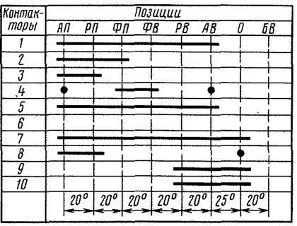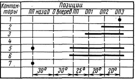 Необходимо отметить, то наличие вентилей перехода препятствует образованию тока короткого замыкания при одновременном включении контакторов 1 и 2, И и 12 или других, аналогичных по схеме. Благодаря этому при переходе на 5-ю позицию контакторы силового контроллера 1 и 11 отключаются без разрыва тока, что позволило их выполнить без дугогашения.