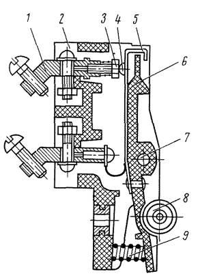 контактом 10. На кронштейне 6 подвижного контакта шарнирно установлен рычаг 8 держателя 7 с контактом 9. Рычаг связан изоляционной тягой 5 со штоком пневматического привода.