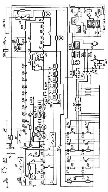 В силовую цепь входят устройства защиты. На стороне высшего напряжения - высоковольтный вилитовый разрядник РВС; воздушный высоковольтный выключатель ВВ; реле отключения высоковольтного выключателя РОВ, обмотка которого питается от трансформатора тока ТТЗ. На стороне низшего напряжения и на стороне постоянного тока установлены реле заземления РЗ и конденсаторы С2, СЗ, С4. В цепь обеих групп тяговых двигателей включены реле перегрузки РП1 и РП2 и быстродействующее дифференциальное реле БДР. К средним точкам двух групп двигателей подключено реле боксования РБ.