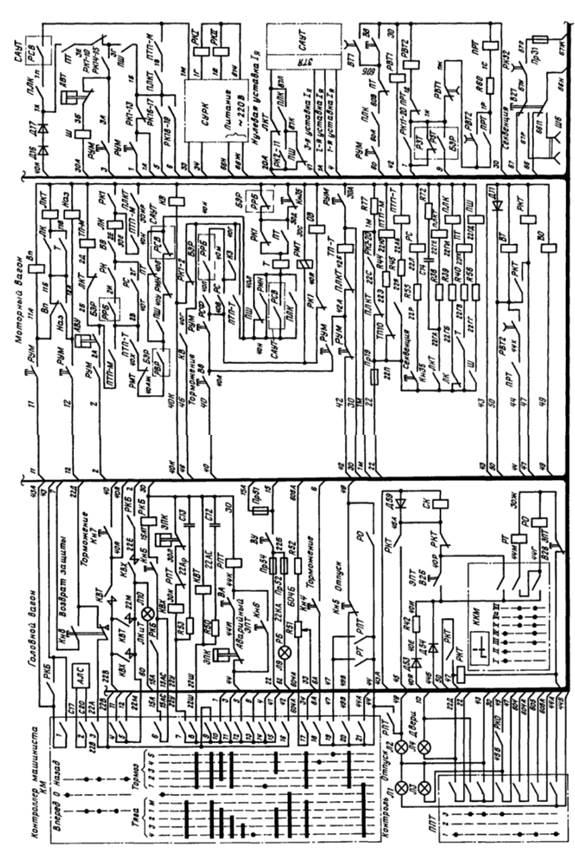 Электрическая схема позволяет проследить путь прохождения тока, взаимодействие аппаратов, определить возможные неисправности. Существуют принципиальные и монтажные схемы. На принципиальных схемах показывают лишь условные изображения катушек и контактов и соединяющие их провода. На монтажных схемах показывают все выводные зажимы аппаратов и приборов, клеммовые рейки, провода с их отпайками и разветвлениями, полную нумерацию и буквенные обозначения проводов. Электрические схемы вычерчивают отдельно для каждого типа вагона: моторного, головного и прицепного. Кроме того, для облегчения изучения и скорейшего усвоения схемы моторного, головного и прицепного вагонов условно разделяют на схемы силовой цепи, вспомогательных цепей и цепей управления.