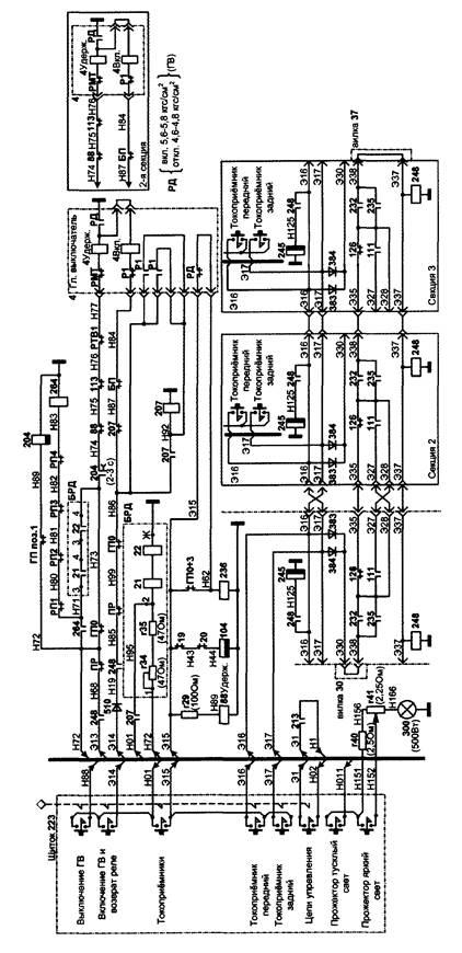 На каждой секции электровоза от провода Э13 через замыкающую блокировку реле 248 по проводу Н68 через размыкающую блокировку переключателя режимов ПР получает питание провод Н72, от которого питаются следующие три цепи: