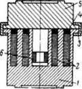 В чувствительном элементе 1 (рисунок 2.5) имеются кольцевые пазы, концентричные относительно оси датчика, в которые уложены коаксиальные обмотки 2. Кольца 4 (из ферромагнетика) замыкают магнитный контур. Верхняя плита 5 с помощью напрессованного на нее кольца 3 прижата к чувствительному элементу. Обмотка 6 предназначена для компенсации влияния температуры на выходной параметр МД.
