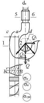 Если нельзя воспользоваться стандартным крюком, то его надо рассчитать. Основным проектным размером является d - диаметр зева крюка. Опасными являются сечения 1-2 и 3-4. Расчет производится в два этапа: определяются размеры опасных сечений, считая крюк прямолинейным брусом; проверяются эти размеры, считая крюк криволинейным брусом.
