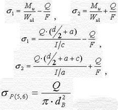 где коэффициент перед дробью учитывает неравномерность нагружения. Опасные сечения: 1-2 - на срез от Q5 , на растяжение и изгиб от Q4; 3-4 - на срез от Q3, на растяжение и изгиб от Q2.