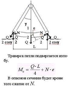 Если груз висит на одном стропе, то в сечении 3-4 возникает напряжение среза от Q2 , изгиба от Q1 и растяжения от Q1.