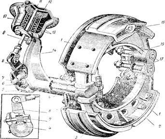 Разборку колесного тормоза начинают со снятия тормозного барабана. Для этого отвертывают винты, крепящие барабан к ступице. Затем снимают стяжную пружину и тормозные колодки.