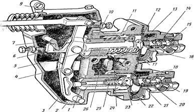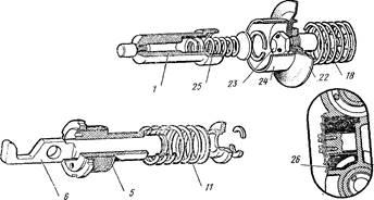 Закрепив кран в тисках, вывертывают корпус включателя стоп-сигнала в сборе. Отвернув болты крепления крышки рычага к корпусу, снимают крышку рычага и прокладку. Вывернув из крышки тормозного крана пробку, вынимают седло впускного клапана, впускной и выпускной клапаны с возвратной пружиной. Затем отвертывают болты крепления крышки тормозного края к корпусу, снимают крышку тормозного крана и вынимают из ее полости седло выпускного клапана с диафрагмой. Из корпуса вынимают стакан с уравновешивающей пружиной. Сборку ведет в последовательности, обратной разборке.
