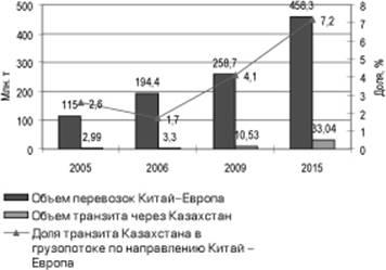 Геополитическая роль Республики Казахстан, то есть роль транзитного моста между Европой и Азией, а также между Россией и Китаем определяется ее расположением в центре евразийского континента. Она расположена на стыке Европы и Азии, благодаря чему обладает значительным транзитным потенциалом, предоставляя азиатским странам географически безальтернативную наземную транспортную связь с Россией и Европой. Главное преимущество, которым обладают транзитные коридоры, проходящие через территорию Казахстана, заключается в существенном сокращении расстояний. При осуществлении сообщения между Европой и Китаем через Казахстан расстояние перевозок уменьшается в два раза по сравнению с морским путем и на тысячу километров по сравнению с транзитом по территории России. Республика Казахстан располагает необходимым потенциалом для серьезной переориентации внешнеторгового баланса. Этот потенциал заключается, прежде всего, в уникальных транзитных возможностях страны: территория Республики Казахстан расположена на направлении сухопутного моста для грузовых потоков между основными макроэкономическими полюсами – странами Европейского Союза и Азиатско-Тихоокеанского региона, Америки и Евразии; сокращение времени доставки транзитных грузов.