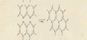 При термообработке на воздухе потемнение ПАН не сопровождается потерей массы и азота, но методом ИК-спектроскопии установлено, что число групп CN уменьшается.[5] Систематическое изучение термического окисления ПАН выполнено Граоси и сотр. По их данным, первой стадией является миграция третичного водорода к азоту с образованием иминной группы (см. схему II). Последующая миграция иминного водорода к группе CN приводит к образованию тетрагидро-пиридиновых (нафтиридиновых) циклов. Переход водорода может происходить внутри макромолекул и между макромолекулами. При внутримолекулярной циклизации сохраняется линейная форма макромолекулы (см. схему III).